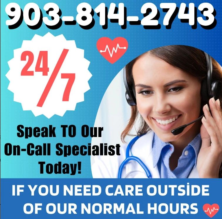 Your health is our priority—day or night, weekends, and holidays, we’re here for you. Call (903)-814-2743 anytime for expert medical support. We have a trained professional waiting by the phone to answer your urgent questions. They can help put you on the schedule for as early as the next day or connect you with emergency service to ensure you get the care you need.